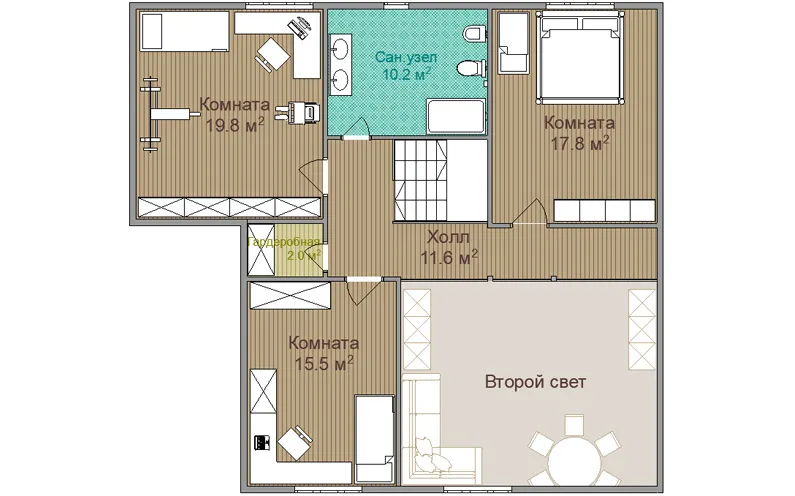 «Аврора 11» — это светлый и просторный дом. Студийная планировка первого этажа позволит с комфортом проводить время большой семье. Размеры технического помещения позволяют оборудовать в нем котельную, соответствующую строительным нормам. В дополнительной изолированной комнате на первом этаже можно организовать кабинет, спальню для гостей или пожилых людей.