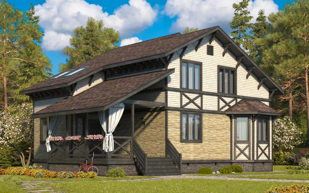 Фасад этого дома решен в лаконичном дачном стиле. А во внутренней планировке воплощен принцип разумной достаточности. Здесь нет архитектурных излишеств, но есть все необходимое для удобства повседневной жизни и отдыха всех членов семьи.